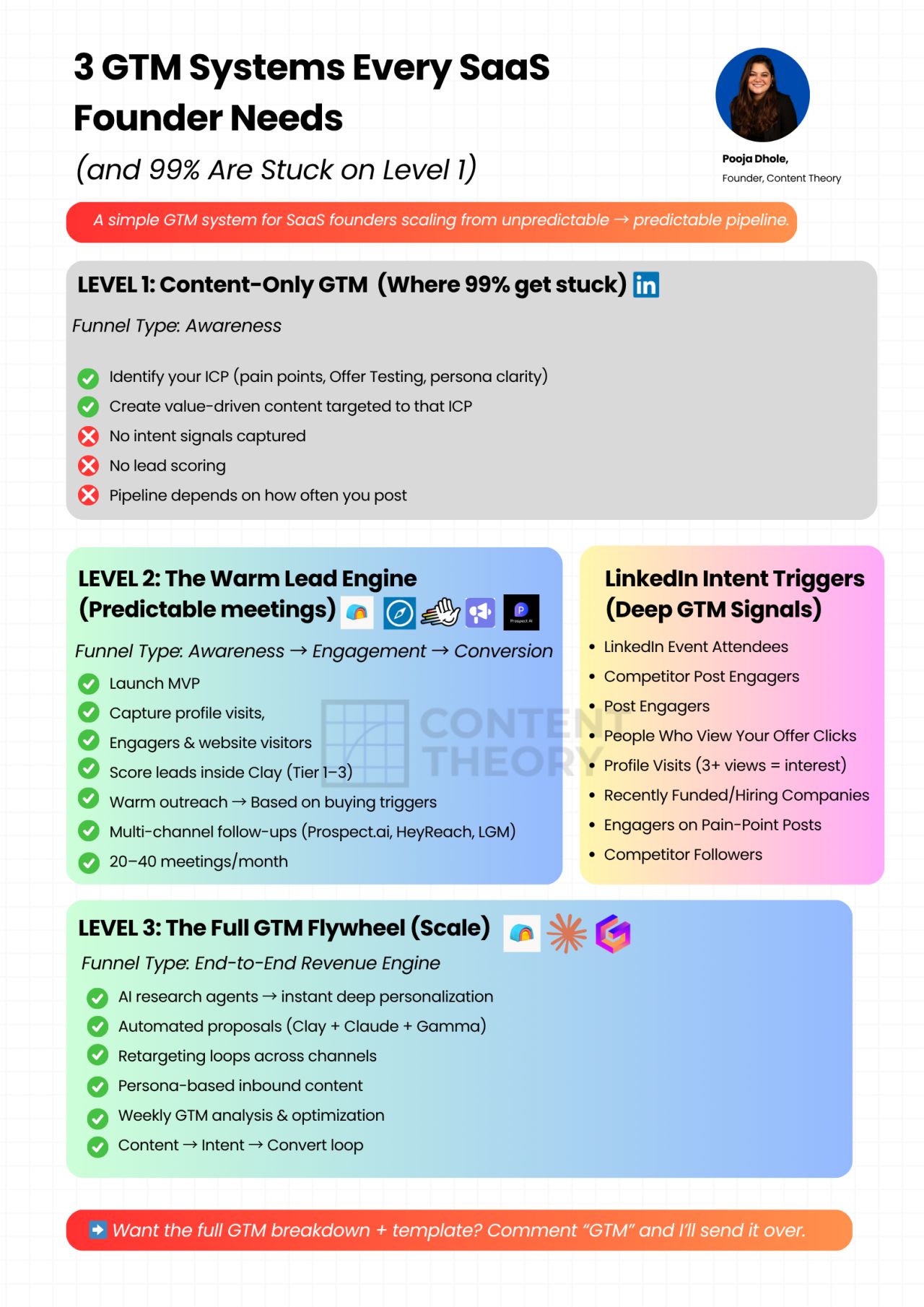 Most founders think their GTM problem is “more leads.” It’s not. It’s system. 99% are stuck at Level 1 (posting and hoping). Here’s how to move to Level 2 (20-40 predictable meetings/month) and Level 3 (scalable revenue engine).